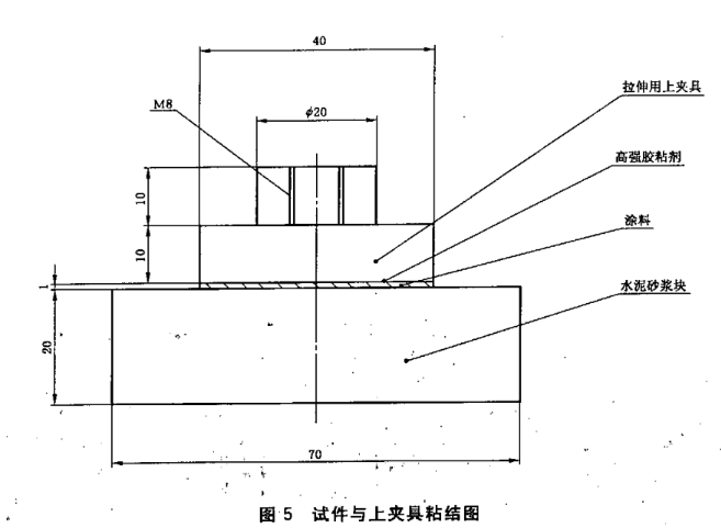 將養(yǎng)護后的試件用高強度膠粘劑將防水涂料粘結(jié)強度試驗機拉伸用上夾具與涂料面粘貼在一起,如圖5所示,小心的除去周圍溢出的膠粘劑,在標(biāo)準試驗條件下水平放置養(yǎng)護24h。然后沿上夾具邊緣一圈用刀切割涂膜至基層,使試驗面積為(40×40)mm。